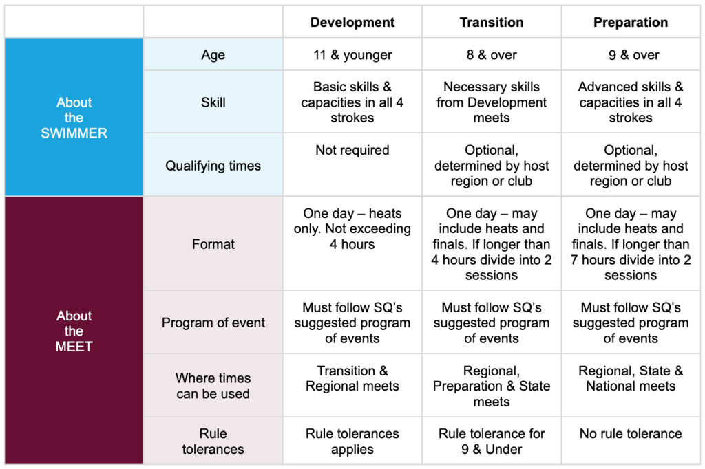 Swimming Queensland classifies competitive meets into three categories: Development, Transition, and Preparation. Each meet type has different requirements, tailored to the needs of swimmers and host clubs. Here’s a quick overview of the different meet types: